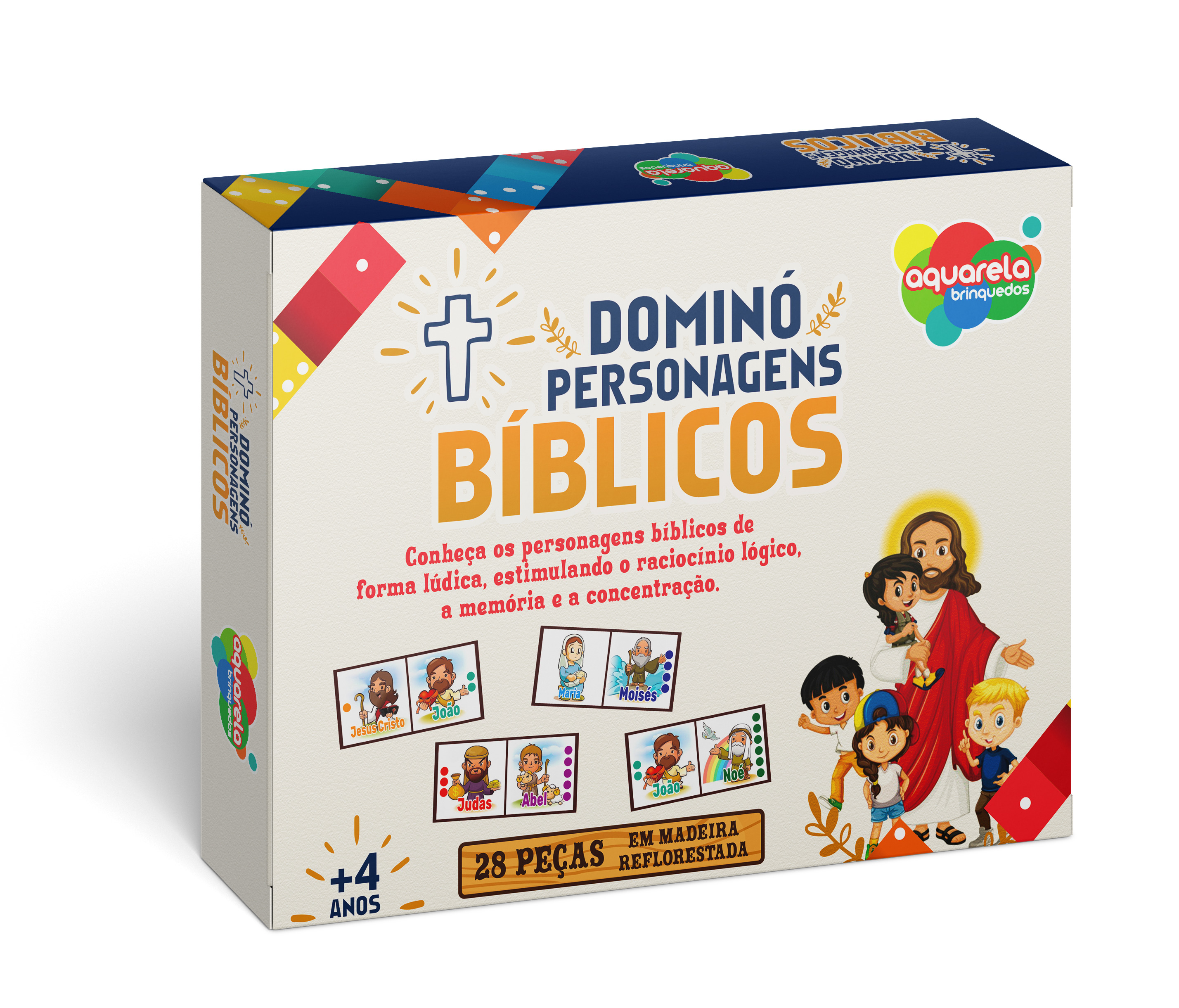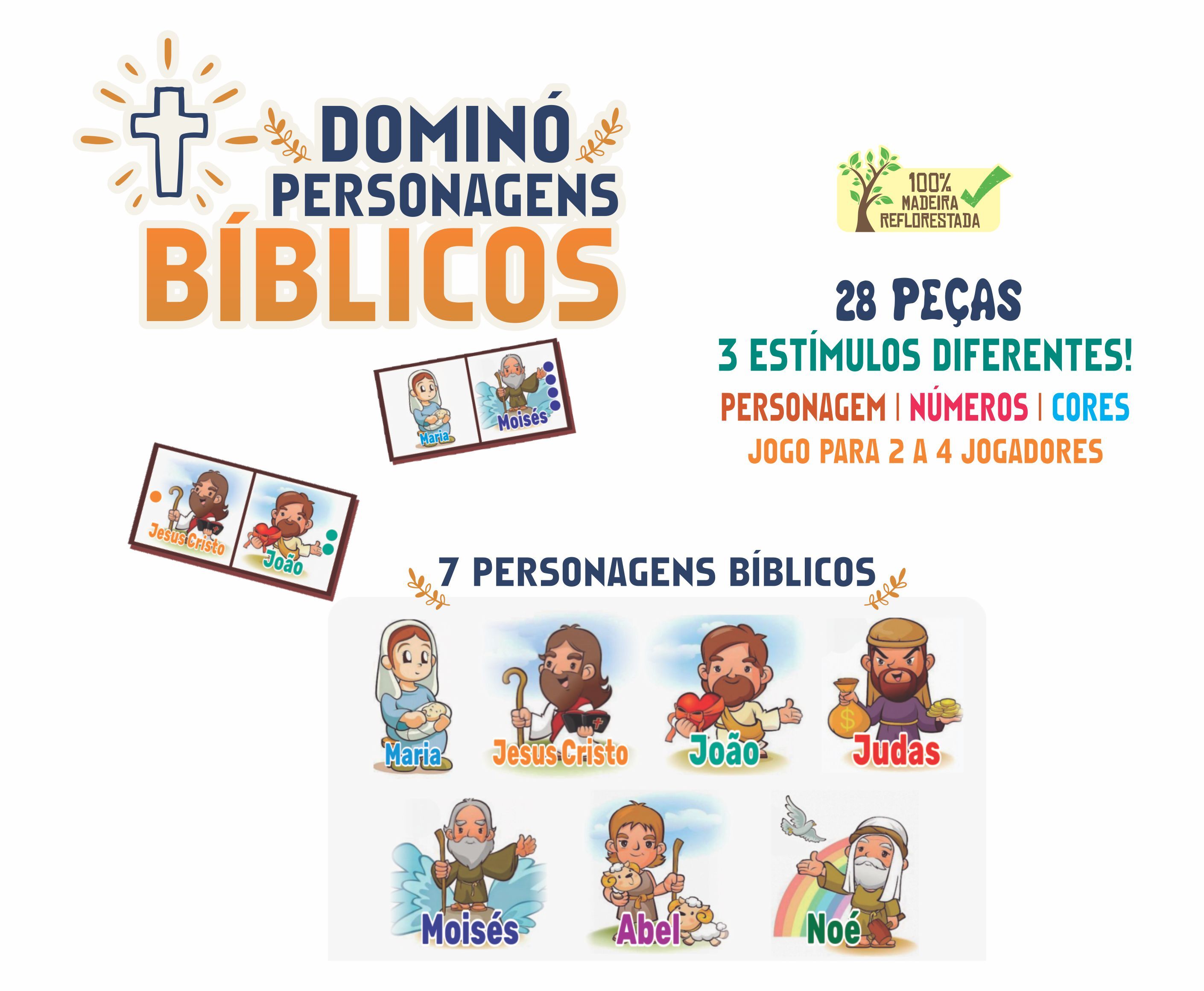 O jogo de Dominó Personagens Bíblicos, com 28 peças em madeira, estimula o aprendizado da matemática, o cálculo mental e o raciocínio.