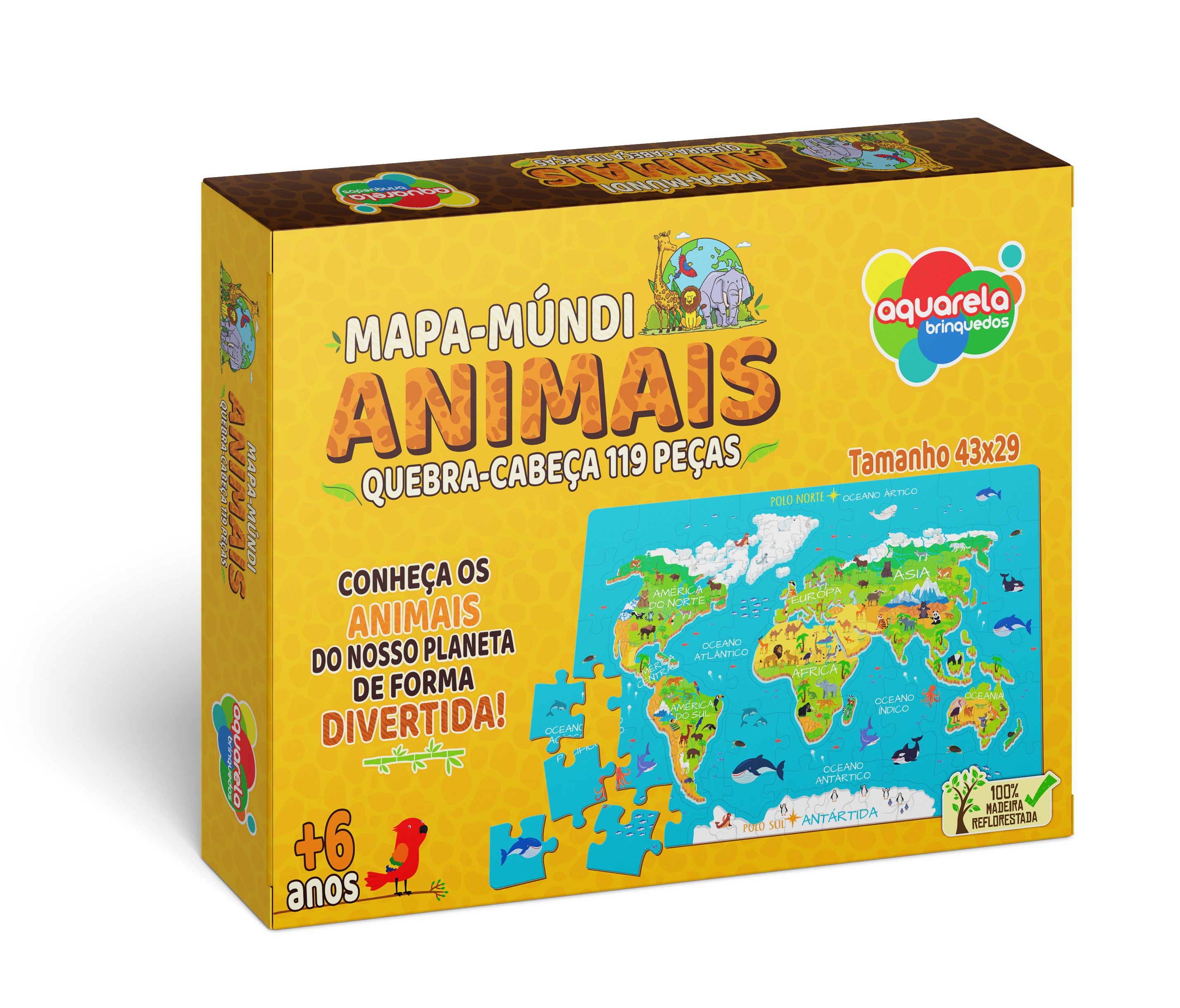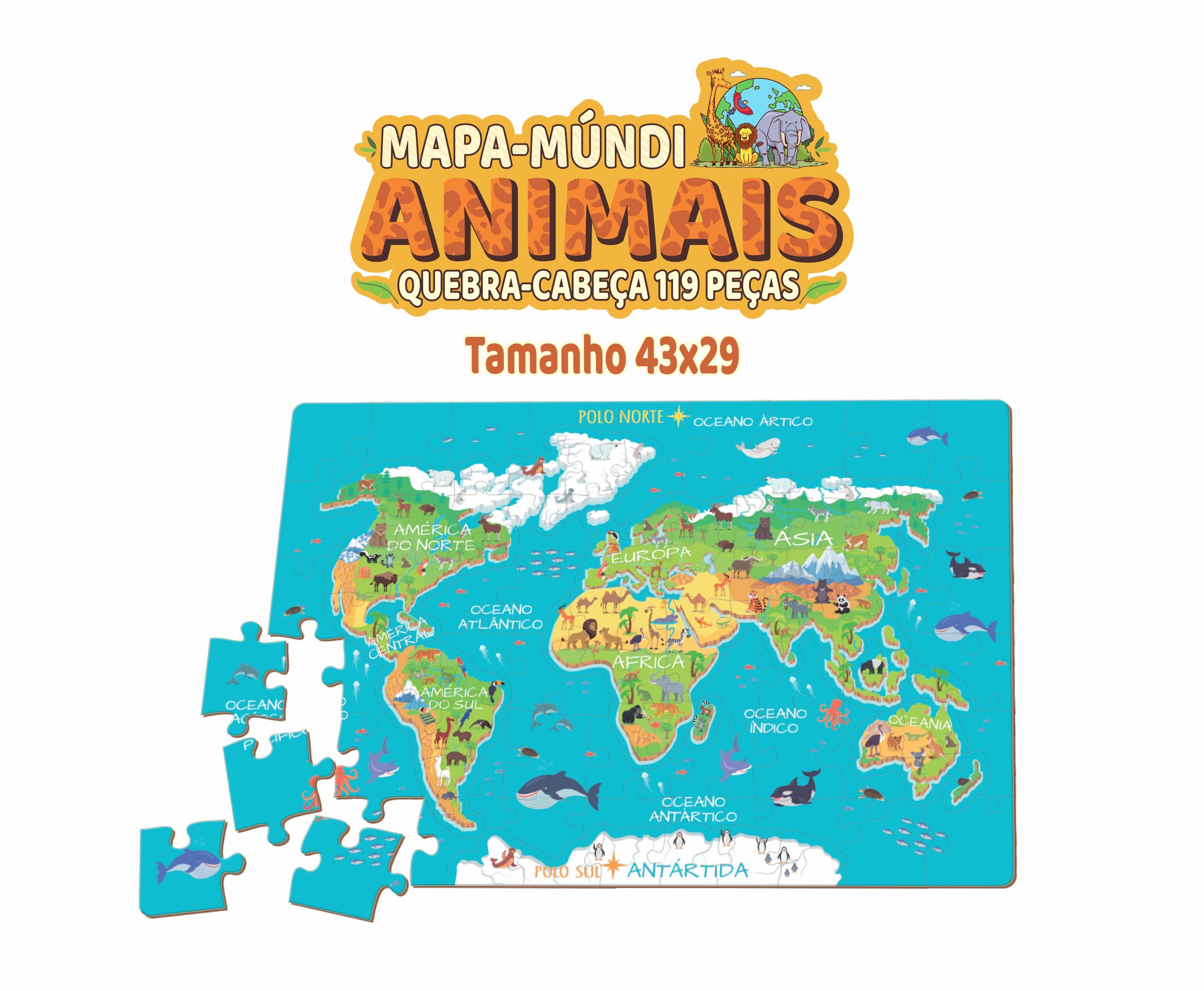 O Quebra-Cabeça Mapa-Múndi Animais, com peças em madeira, combina diversão e aprendizado ao apresentar continentes e animais de diferentes regiões do mundo. Estimula o conhecimento geográfico, a coordenação motora e a curiosidade sobre a fauna global.