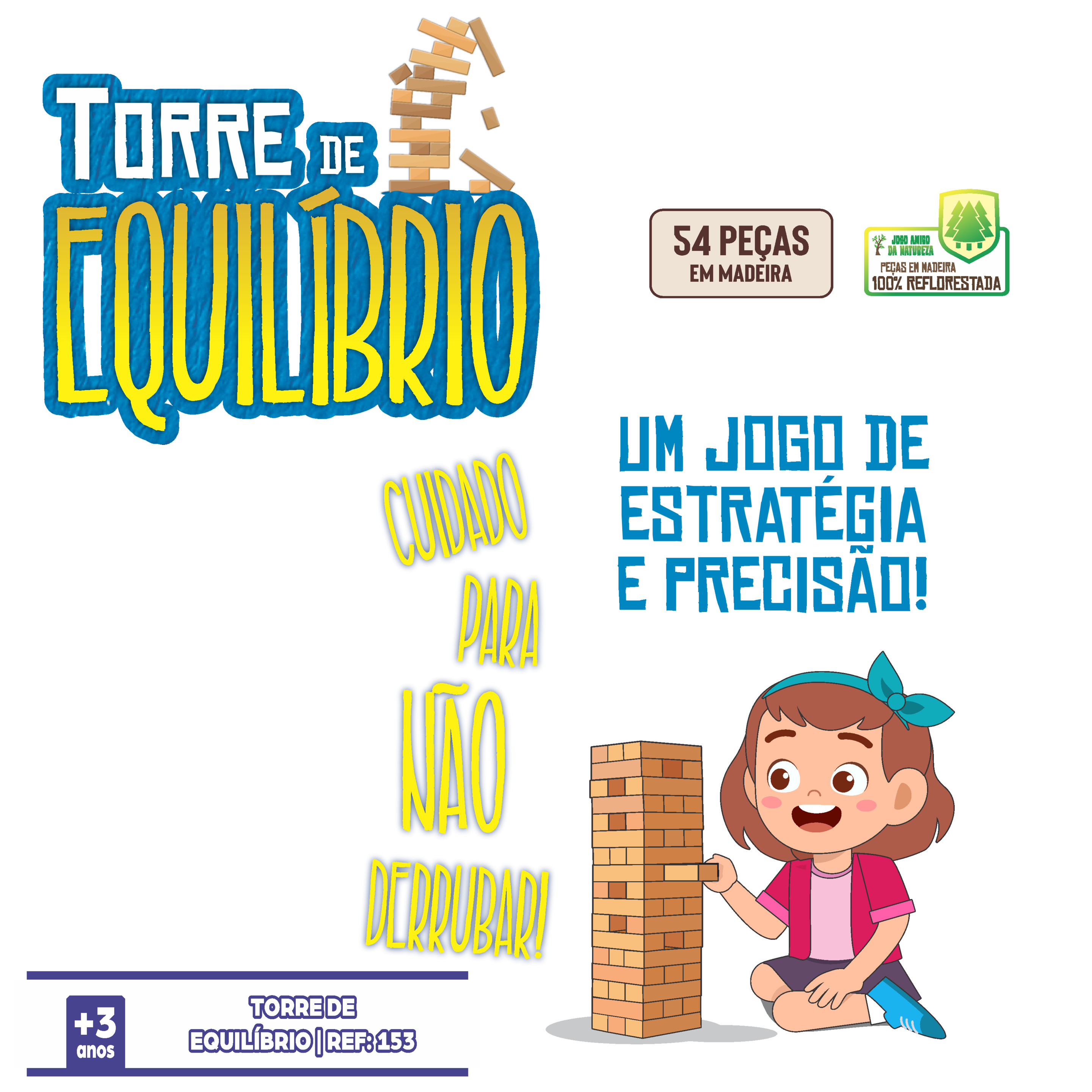 A Torre de Equilíbrio é um jogo clássico de habilidade e estratégia com peças de madeira. Os jogadores removem e reposicionam as peças da torre sem deixá-la cair, estimulando a coordenação motora, o raciocínio lógico e a concentração em partidas divertidas e desafiadoras.